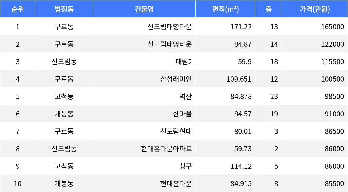 52주차 구로구 매매가 상위 매물 분석