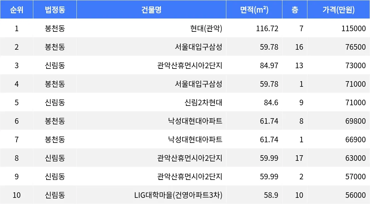 봉천동 서울대입구삼성 59.78㎡ 1층 매물이 7억1천만원에 거래됐다. 신림동 신림2차현대 84.6㎡ 9층 매물이 7억1천만원에 거래되었다.