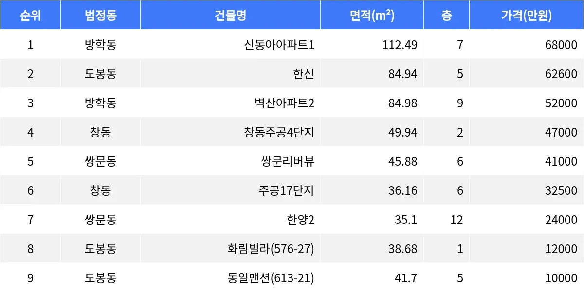 쌍문동 한양2 35.1㎡ 매물이 2억4천만원에 거래되었다. 도봉동 화림빌라 576-27번지 소재 38.68㎡의 주택 매물이 1억2천만원에 손바뀜이 일어났다. 도봉동 동일맨션 613-21번지 소재 41.7㎡의 주택 매물이 1억원에 매매되었다.