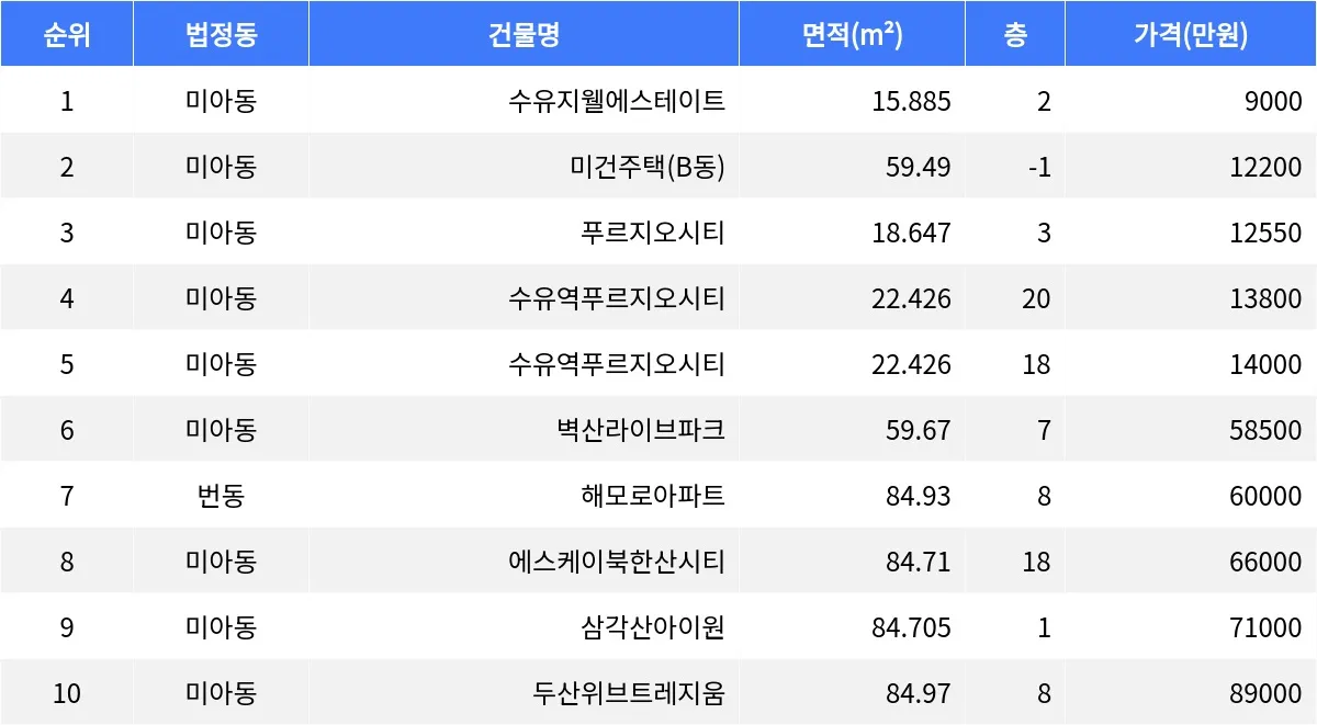 강북구 미아동 벽산라이브파크 59.67㎡ 7층 매물이 5억8천5백만원에 거래됐다. 번동 해모로아파트 84.93㎡ 8층 매물이 6억원에 손바뀜이 일어났다.