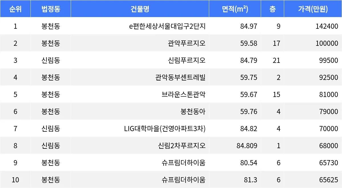 봉천동 봉천동아 59.76㎡ 4층 매물은 7억9천만원에 거래됐고, 신림동 LIG대학마을 84.82㎡ 4층 매물은 7억원에 손바뀜이 일어났다.