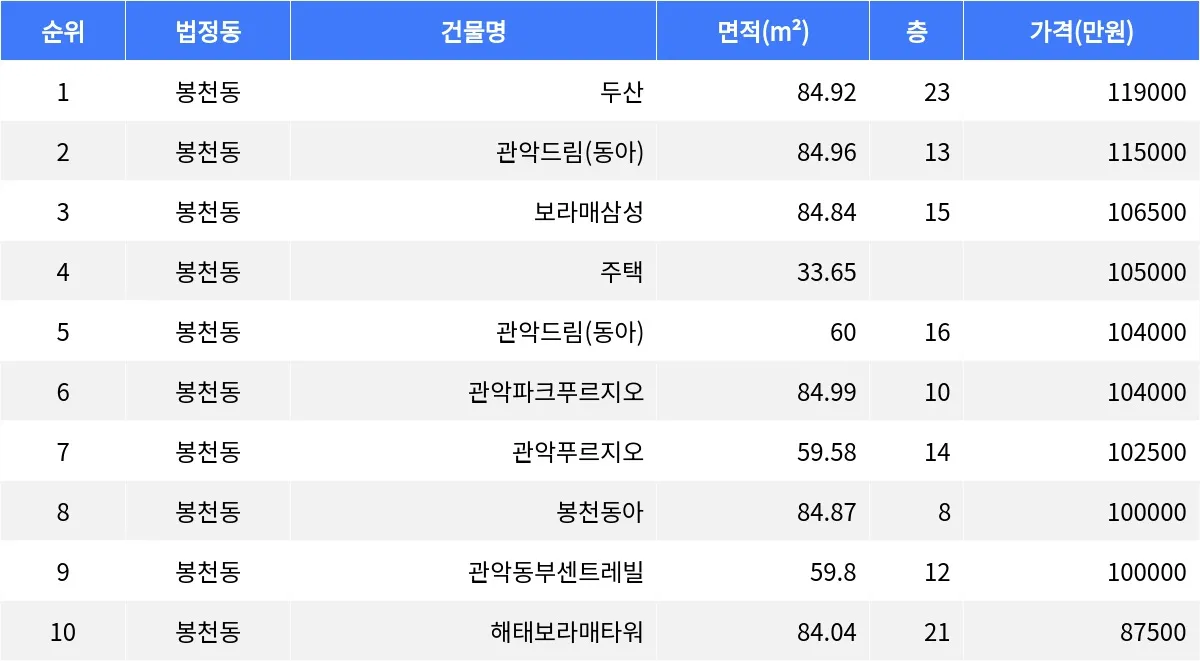 봉천동 봉천동아 84.87㎡ 8층 매물이 10억원에 거래됐다. 봉천동 관악동부센트레빌 59.8㎡ 12층 매물이 10억원에 매매됐다.