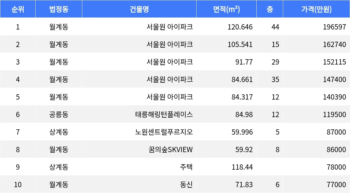 월계동 서울원 아이파크 105.541㎡ 15층 매물이 16억2천7백40만원에 거래됐다. 같은 건물의 91.77㎡ 29층 매물은 15억2천1백15만원에 매매가 이루어졌다. 또한, 서울원 아이파크의 84.661㎡ 35층 매물은 14억7천4백만원에 계약됐다.