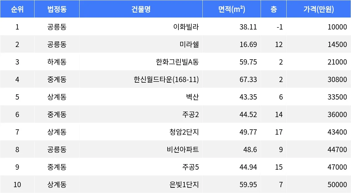 공릉동 미라쉘 16.69㎡ 12층 매물이 1억4천5백만원에 거래되었다. 하계동 한화그린빌A동 59.75㎡ 2층 매물이 2억1천만원에 거래됐다. 중계동 한신월드타운 67.33㎡ 2층 매물이 3억8백만원에 거래됐다. 상계동 벽산 43.35㎡ 6층 매물이 3억3천5백만원에 거래됐다. 중계동 주공2 44.52㎡ 14층 매물이 3억6천만원에 거래됐다. 상계동 청암2단지 49.77㎡ 17층 매물이 4억3천4백만원에 거래됐다. 공릉동 비선아파트 48.6㎡ 9층 매물이 4억4천7백만원에 거래됐다. 중계동 주공5 44.94㎡ 15층 매물이 4억7천만원에 거래됐다. 상계동 은빛1단지 59.95㎡ 7층 매물이 5억원에 거래되었다.