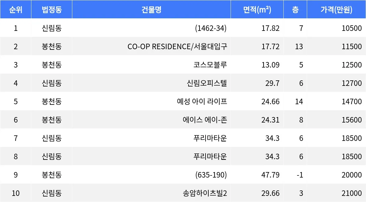 봉천동 CO-OP RESIDENCE/서울대입구 17.72㎡ 13층 매물이 1억1천5백만원에 거래되었다. 봉천동 코스모블루 13.09㎡ 5층 매물이 1억2천5백만원에 손바뀜이 일어났다.