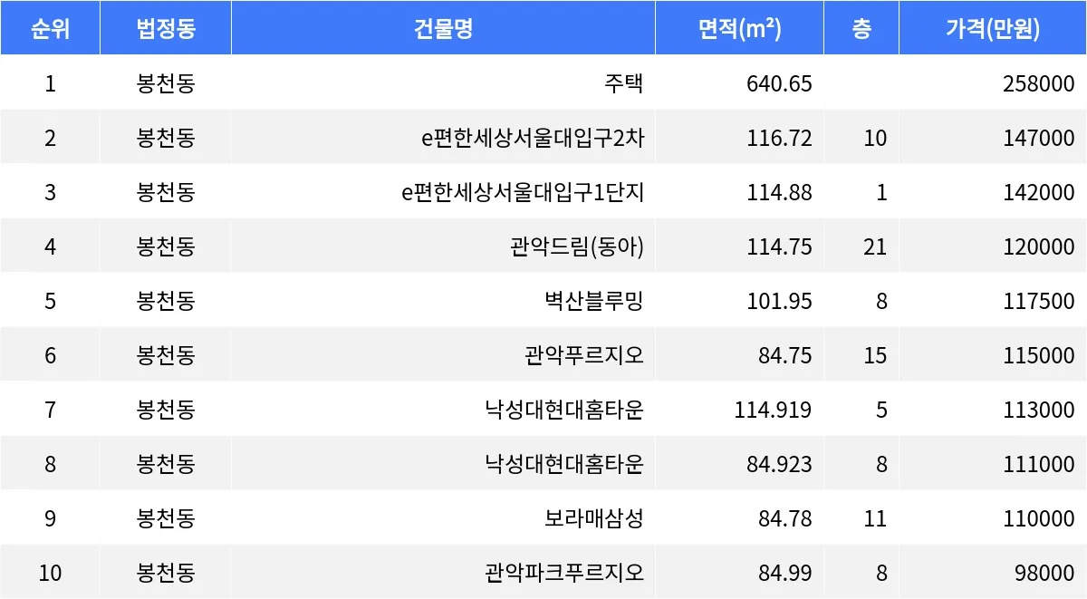봉천동 낙성대현대홈타운 전용면적 84.92㎡ 8층 매물이 11억1천만원에 거래됐고, 봉천동 보라매삼성 전용면적 84.78㎡ 11층 매물이 11억원에 매매됐다.