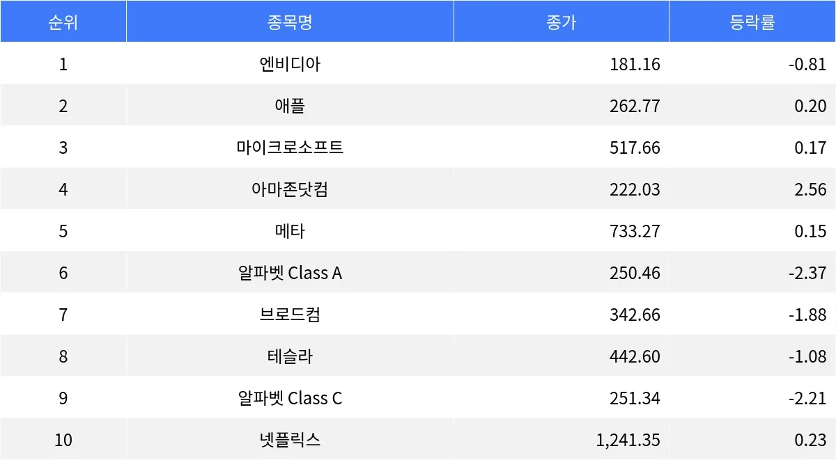 반면, 하락세를 보인 종목들도 있었다. 알파벳 Class A는 2.37% 하락하며 250.46달러에 거래를 마쳤고, 거래량은 4천 616만 549주였다. 전 거래일 대비 6.09달러 하락했다. 엔비디아는 0.81% 하락하며 181.16달러에 장을 마감했고, 거래량은 1억 1천 901만 5천 76주였다. 전 거래일 대비 1.48달러 하락했다. 브로드컴은 1.88% 하락하며 종가 342.66달러를 기록했고, 거래량은 1천 505만 261주였다.