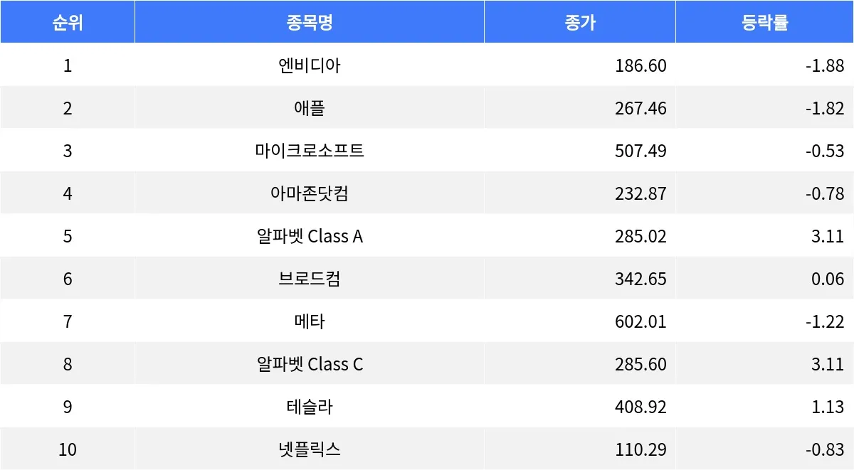 반면, 엔비디아는 1.88% 하락하여 186.60달러에 거래를 마쳤다. 거래량은 1억 7천 423만 81주로 전 거래일 대비 3.57% 감소했다. 애플도 1.82% 하락하여 267.46달러를 기록했으며, 거래량은 4천 297만 7천 962주로 전 거래일 대비 4.95% 감소했다.