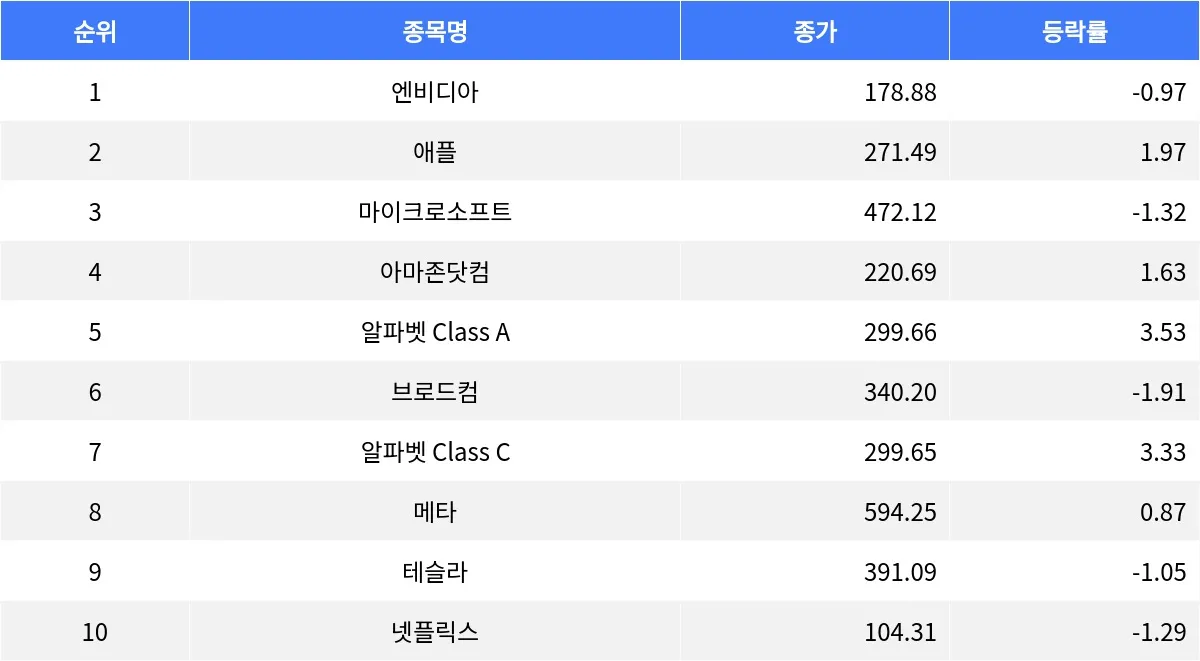 반면, 엔비디아는 등락률 -0.97%로 하락해 종가 178.88달러에 거래를 마쳤다. 거래량은 3억 4천 401만 1천 965주로, 전 거래일 대비 1.76포인트 하락한 모습을 보였다. 마이크로소프트도 등락률 -1.32%로 종가 472.12달러에 마감하며 전 거래일 대비 6.31포인트 하락했다. 브로드컴과 테슬라도 각각 등락률 -1.91%와 -1.05%로 하락세를 기록했다.