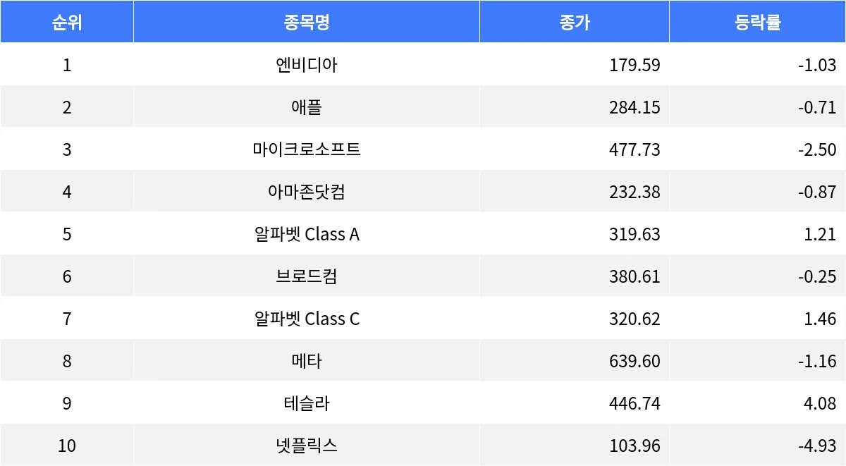 반면, 넷플릭스는 4.93% 하락하며 종가 103.96달러로 장을 마감했다. 거래량은 5천 300만 904주로 전 거래일 대비 5.39달러 하락한 것으로 나타났다. 마이크로소프트는 2.50% 하락해 477.73달러에 거래를 마쳤으며, 전 거래일 대비 12.27달러 하락했다. 거래량은 3천 350만 2천 417주로 기록되었다.