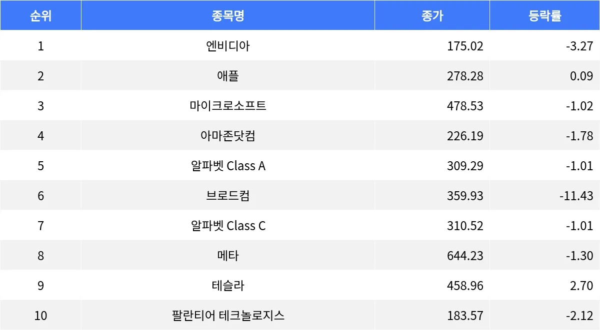 하락세를 보인 종목으로는 브로드컴이 눈에 띄었다. 브로드컴은 11.43% 하락하여 359.93달러에 거래를 마쳤으며, 거래량은 9천 324만 1301주였다. 엔비디아 또한 3.27% 하락한 175.02달러에 거래를 종료했으며, 거래량은 2억 223만 9976주에 이르렀다. 마이크로소프트는 1.02% 하락해 종가 478.53달러를 기록했다.