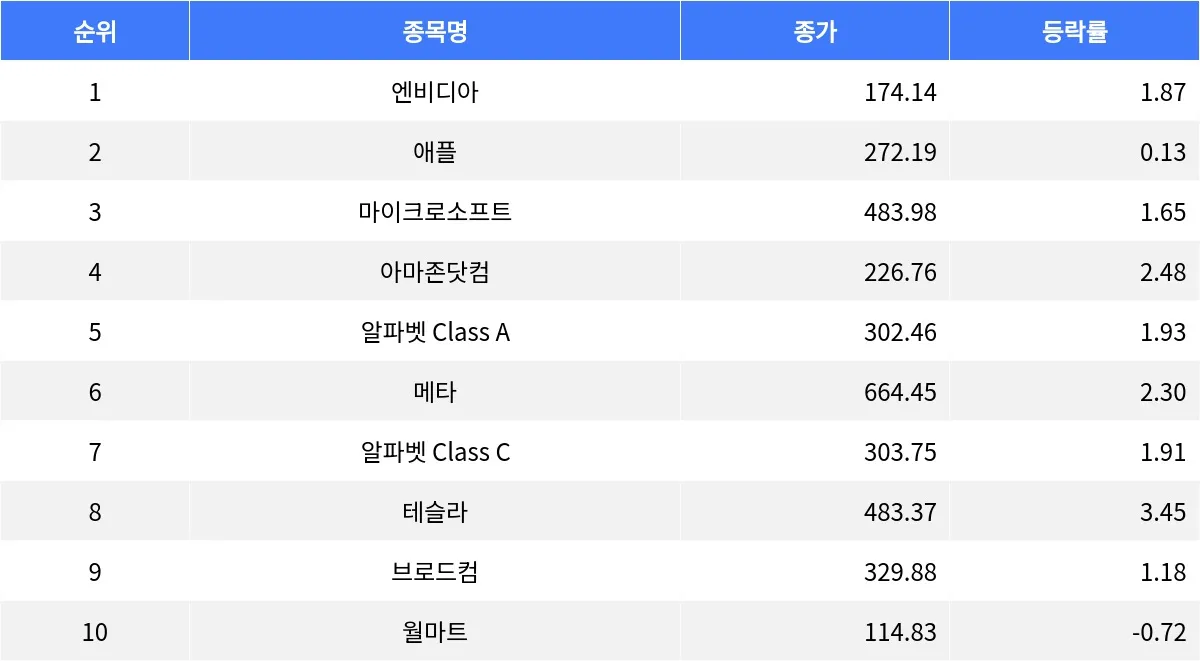 2023년 10월 23일 기준, 나스닥 종합 시가총액 상위 종목들이 전반적으로 상승세를 보였다. 주요 기술주들이 강세를 나타내며 시장의 긍정적인 분위기를 주도했다.