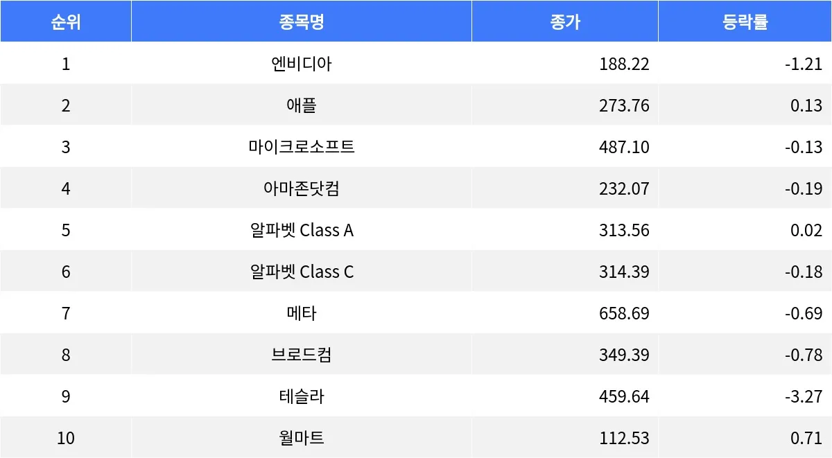 반면, 테슬라는 3.27% 하락하며 종가 459.64달러를 기록했다. 거래량은 6천 446만 5천 718주로 전 거래일 대비 15.55달러 하락했다. 엔비디아는 1.21% 하락해 종가 188.22달러를 기록하며 거래량은 1억 1930만 7천 979주로 나타났다. 마이크로소프트도 0.13% 하락하며 종가 487.10달러를 기록했다.