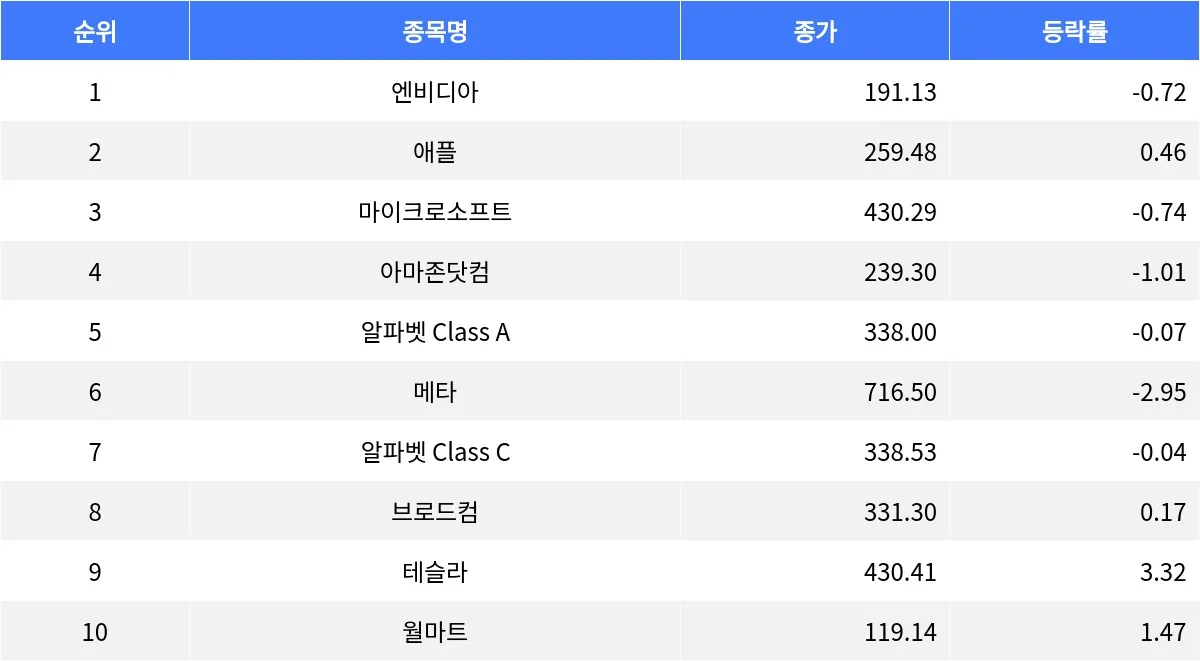 30일(현지시간) 기준, 나스닥 종합 시가총액 상위 종목은 혼조세를 보였다. 주요 기술주들의 등락이 엇갈리면서 투자자들은 신중한 태도를 유지했다.