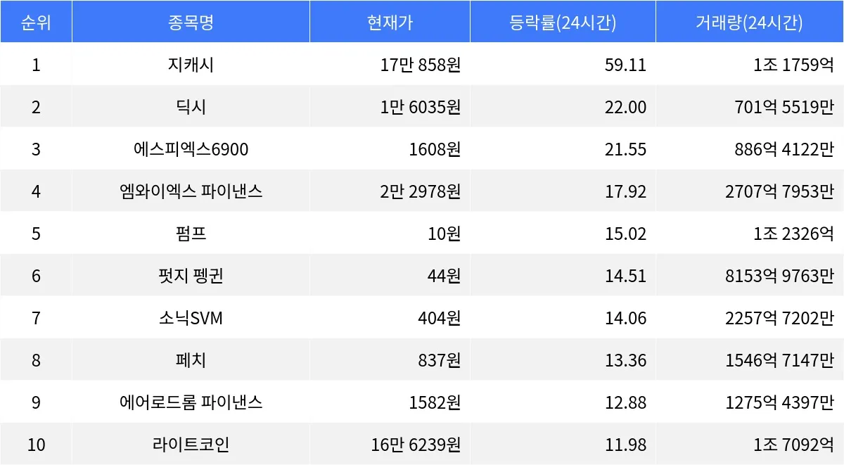 같은 시각, 펏지 펭귄은 24시간 동안 14.51% 상승하며 현재 44원에 거래되고 있다. 1시간 등락률은 -0.40%로 나타났다. 소닉SVM은 24시간 동안 14.06% 상승하며 현재 404원에 거래되고 있으며, 1시간 동안 0.94% 상승세를 보이고 있다. 페치는 24시간 동안 13.36% 상승하며 현재 837원에 거래되고 있다. 1시간 등락률은 -0.18%로 나타났다. 에어로드롬 파이낸스는 24시간 동안 12.88% 상승하며 현재 1582원에 거래되고 있으며, 1시간 동안 0.47% 상승세를 보이고 있다. 라이트코인은 24시간 동안 11.98% 상승하며 현재 16만 6239원에 거래되고 있다. 1시간 동안 0.39% 상승세를 보였다.