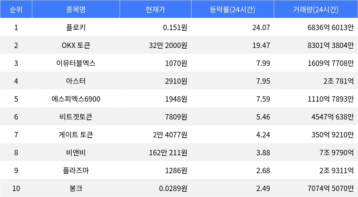 비트겟토큰은 24시간 동안 5.46% 상승해 7809원에 거래되고 있으며, 1시간 등락률은 1.13%로 단기 상승세를 이어가고 있다. 게이트 토큰은 4.24% 상승해 2만 4077원에 거래 중이며, 1시간 등락률은 -0.98%로 하락세를 보이고 있다. 플라즈마는 2.68% 상승해 1286원에 거래되며, 봉크는 2.49% 상승해 0.0289원에 거래되고 있다. 두 종목 모두 1시간 등락률에서는 각각 -0.89%와 -1.45%로 하락세를 보이고 있다.
