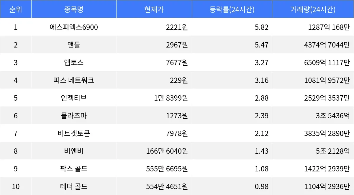 맨틀 역시 24시간 동안 5.47% 상승하며 2967원에 거래 중이다. 맨틀은 시가총액 24위를 차지하고 있으며, 거래량은 4374억 7044만 주에 달한다. 그러나 1시간 등락률은 -0.63%로 단기적으로는 소폭 하락세를 보이고 있다. 이는 단기적으로 조정 국면에 있을 가능성을 내포한다.