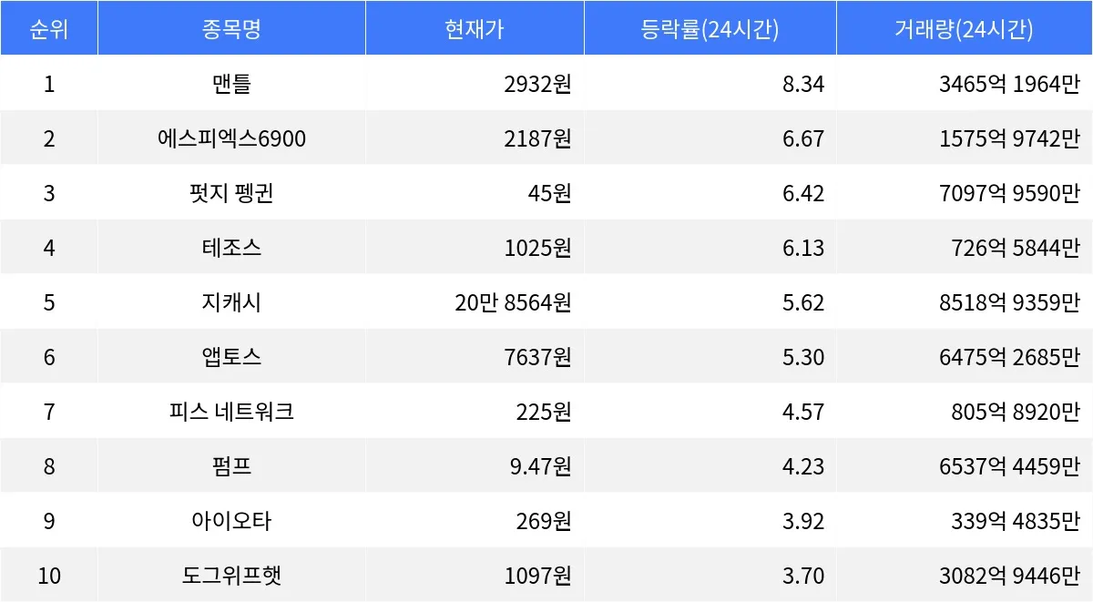 글로벌 가상자산 시황 중계 사이트 코인마켓캡(CoinMarketCap)에 따르면, 맨틀이 암호화폐 시장에서 가장 높은 24시간 등락률을 기록하며 주목받고 있다. 맨틀은 24시간 동안 8.34% 상승하여 현재 2932원에 거래되고 있다. 이는 9조 5406억 원의 시가총액을 기록하며, 시가총액 기준으로 25위에 올랐다. 24시간 동안 거래량은 3465억 1964만 원을 기록하며 강한 상승세를 보였다. 1시간 등락률은 0.05% 상승하며 안정적인 흐름을 유지하고 있다.에스피엑스6900은 24시간 동안 6.67% 상승하여 현재 2187원에 거래되고 있다. 시가총액이 2조 366억 원으로 69위에 위치해 있으며, 24시간 거래량은 1575억 9742만 원으로 집계되었다. 그러나 1시간 등락률은 -1.10%로 소폭 하락을 기록하며 단기적으로는 상승세가 주춤한 모습을 보이고 있다.