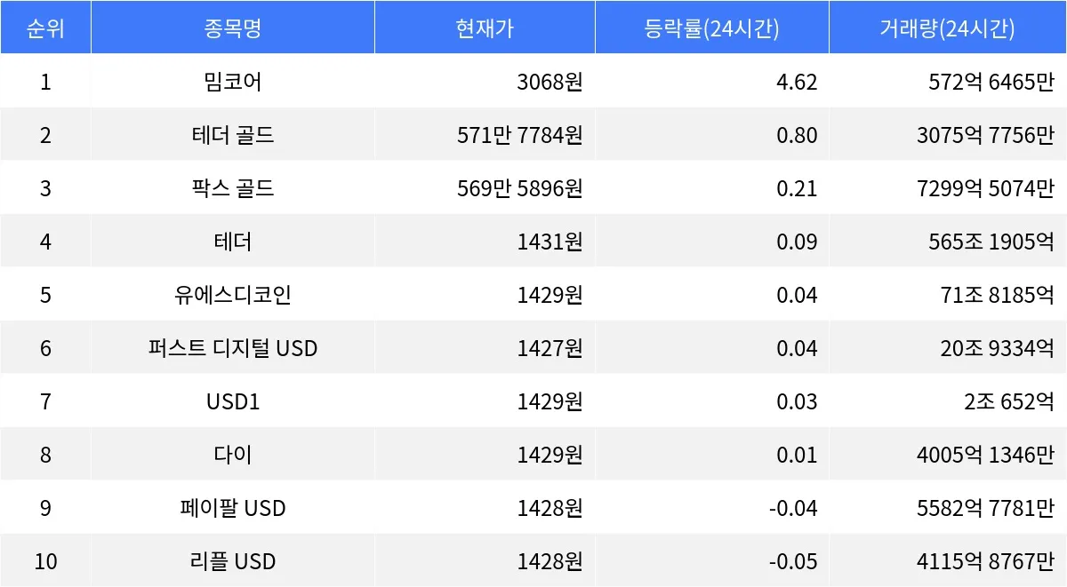 밈코어는 최근 들어 밈과 관련된 코인들이 주목받으면서 상승세를 보이고 있다. 반면 테더 골드와 팍스 골드는 금과 연관된 스테이블 코인으로, 시장 안정성을 추구하는 투자자들 사이에서 인기가 높다. 유에스디코인은 다른 스테이블 코인들과 마찬가지로 법정화폐와의 1대1 교환을 목표로 하여 변동성을 최소화하는 전략을 취하고 있다.