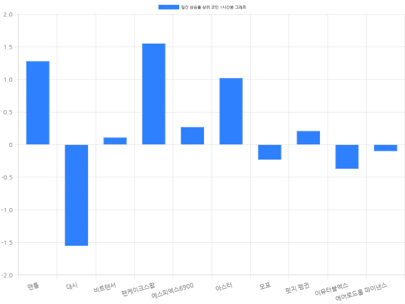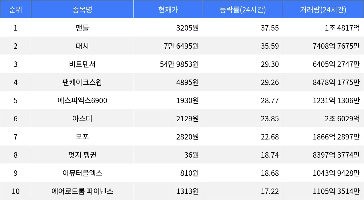한편, 아스터는 24시간 동안 23.85% 상승하며 2129원에 거래되고 있으며, 1시간 등락률은 1.02%로 추가 상승 가능성을 보여주고 있다. 모포는 24시간 동안 22.68% 상승하며 2820원에 거래되고 있으나, 1시간 등락률은 -0.23%로 다소 주춤한 모습을 보이고 있다. 펏지 펭귄은 24시간 동안 18.74% 상승하여 36원에 거래되고 있으며, 이뮤터블엑스는 18.68% 상승하며 810원에 거래 중이다. 마지막으로 에어로드롬 파이낸스는 17.22% 상승하며 1313원에 거래되고 있다.