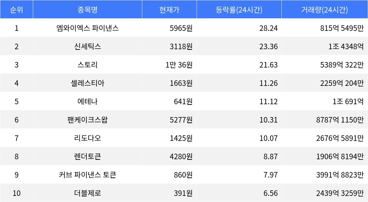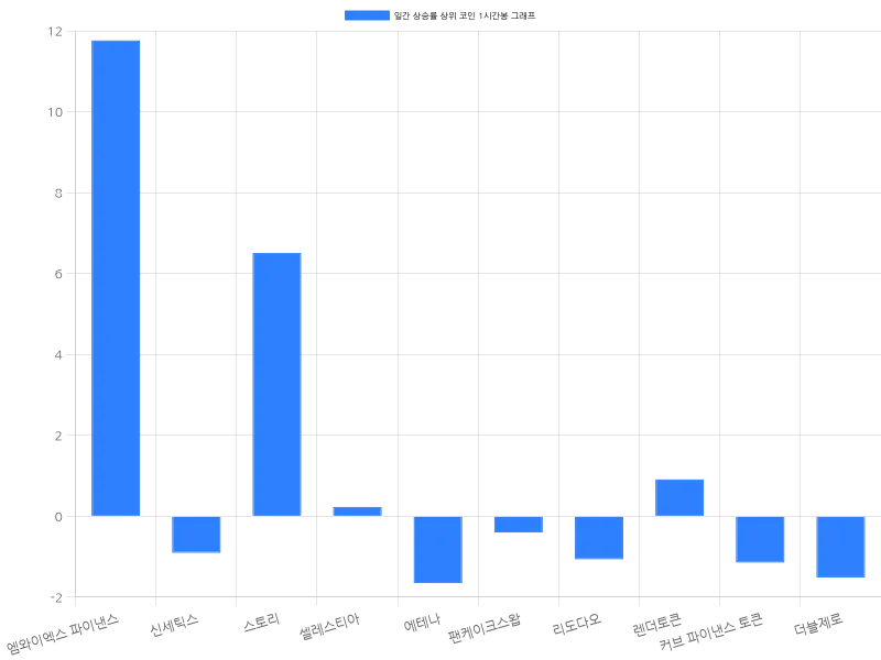 한편, 팬케이크스왑은 24시간 동안 10.31% 상승하며 현재 5277원에 거래되고 있다. 리도다오는 24시간 동안 10.07% 상승하여 현재 1425원에 거래 중이다. 렌더토큰은 24시간 동안 8.87% 상승하며 현재 4280원에 거래되고 있다. 커브 파이낸스 토큰은 24시간 동안 7.97% 상승하여 860원에 거래 중이다. 더블제로는 24시간 동안 6.56% 상승하며 현재 391원에 거래되고 있다.