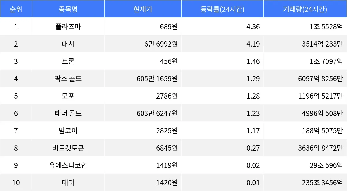 글로벌 가상자산 시황 중계 사이트 코인마켓캡(CoinMarketCap)에 따르면, 암호화폐 시장에서 플라즈마가 24시간 동안 4.36% 상승하며 시가총액 300위권 내 24시간 등락률 1위를 기록했다. 현재 플라즈마는 689원에 거래되고 있으며, 24시간 거래량은 1조 5528억 원에 달한다. 시가총액은 1조 2419억 원으로 78위를 차지하고 있으며, 1시간 동안 0.60% 상승하여 상승세를 이어가고 있다.