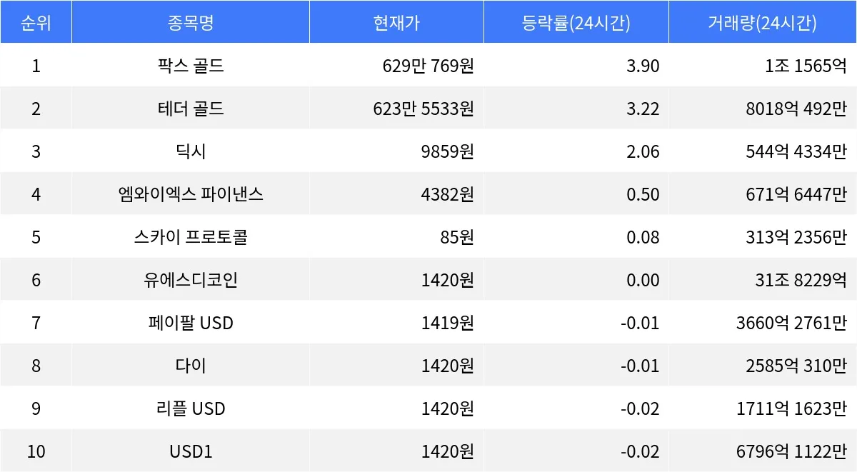 같은 시각 유에스디코인은 등락 없이 1420원에 거래되고 있으며, 24시간 거래량은 31조 8229억 원으로 여전히 안정적인 거래량을 유지하고 있다.