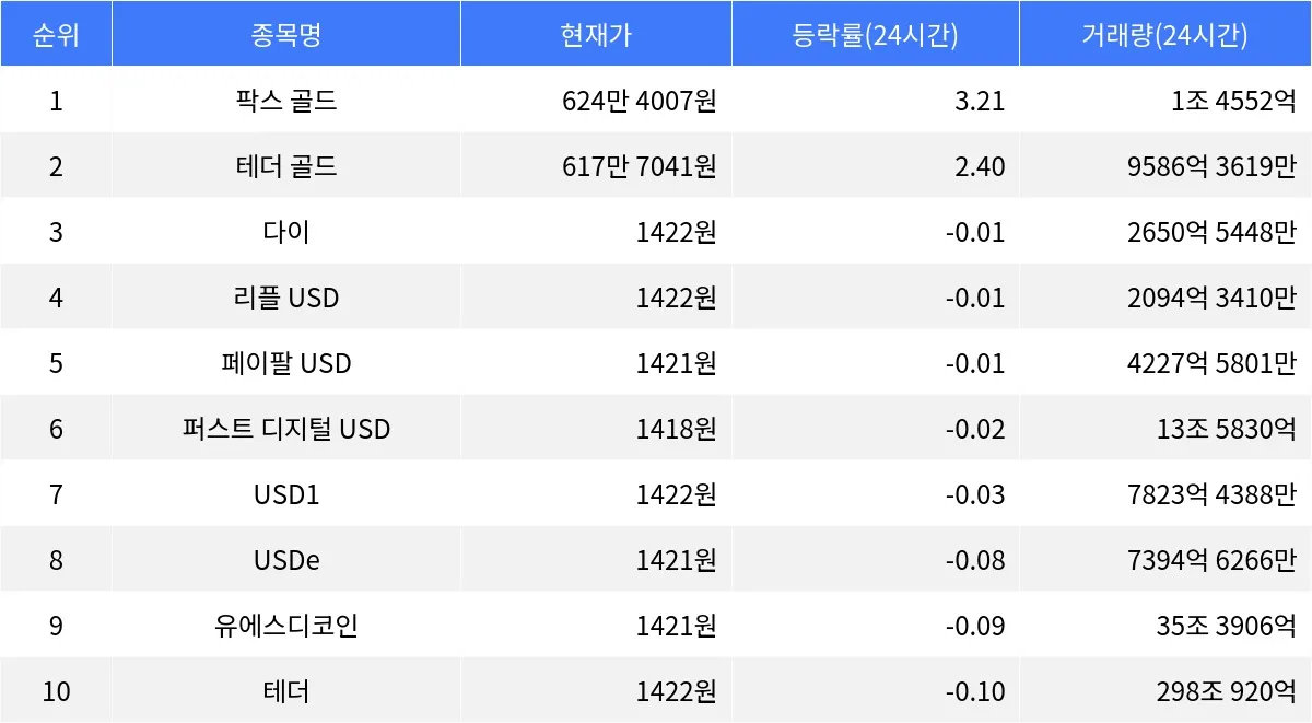 테더 골드 역시 상승세를 보이며 24시간 동안 2.40% 증가했다. 현재가는 617만 7041원이며, 1시간 등락률은 -0.20%로 하락세에 있다. 테더 골드는 시가총액 66위에 위치하며, 9586억 3619만 원의 거래량을 기록했다.