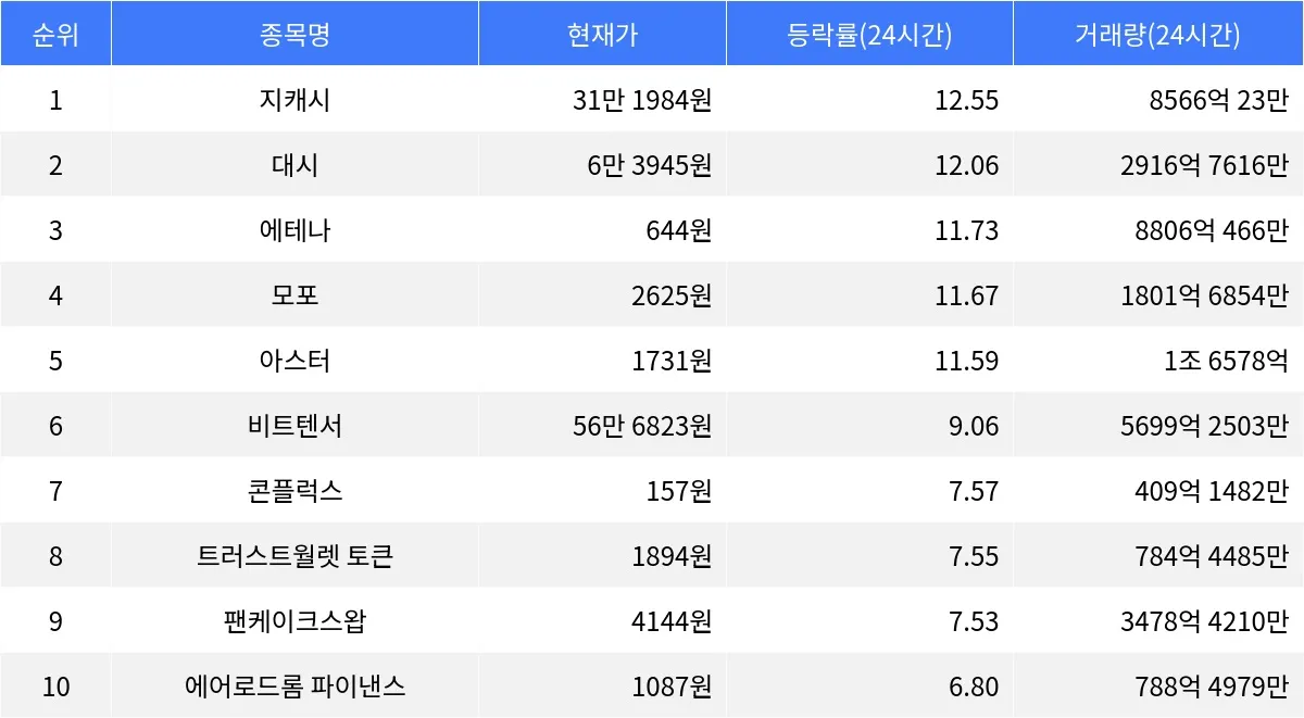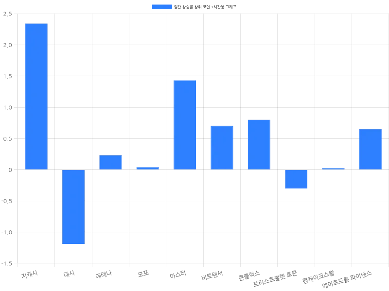 시가총액 32위의 에테나는 24시간 동안 11.73% 상승하며 644원에 거래되고 있다. 1시간 동안 0.23% 상승하며 안정적인 상승세를 유지하고 있다. 모포(MoFo)는 24시간 동안 11.67% 상승하며 현재 2625원에 거래 중이다. 1시간 등락률은 0.04%로 거의 변동 없이 상승 추세를 이어가고 있다. 시가총액 40위의 아스터(Astar)는 24시간 동안 11.59% 상승하며 1731원에 거래되고 있으며, 1시간 등락률은 1.43%로 단기 상승세가 강화되는 모습이다.