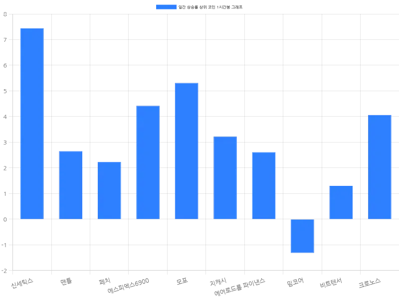 시가총액 88위의 페치는 24시간 동안 10.33% 상승하며 411원에 거래되고 있다. 한 시간 동안 2.23% 상승하며 상승세를 지속하고 있다. 에스피엑스6900은 24시간 동안 9.51% 상승해 1481원에 거래 중이며, 시가총액 순위는 74위다. 한 시간 동안 4.42% 상승하며 단기적인 상승세를 보여주고 있다. 모포는 24시간 동안 8.75% 상승해 2982원에 거래되고 있으며, 시가총액 86위를 기록하고 있다. 한 시간 동안 5.31% 상승하면서 강한 단기 상승세를 보이고 있다.