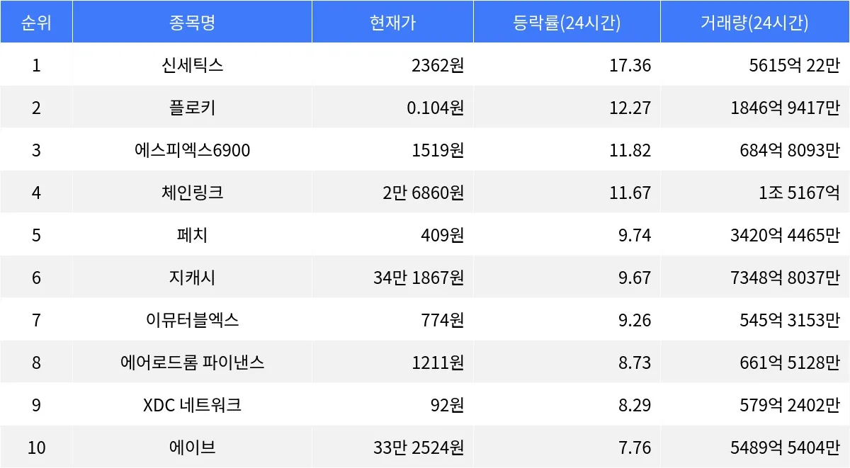 시가총액 74위의 에스피엑스6900(SPX6900)은 24시간 동안 11.82% 상승하며 현재 1519원에 거래되고 있다. 한 시간 동안 0.88% 하락했으나, 최근의 상승세를 고려하면 안정적인 조정으로 보인다. 체인링크(Chainlink)는 시가총액 12위로, 24시간 동안 11.67% 상승하며 현재 2만 6860원에 거래되고 있다. 1시간 등락률은 0.64% 상승하여 꾸준한 상승세를 유지하고 있다. 페치(Fetch)는 시가총액 89위로, 24시간 동안 9.74% 상승하며 현재 409원에 거래되고 있다. 1시간 동안 0.86% 하락했으나, 전반적인 상승세가 지속되고 있다.