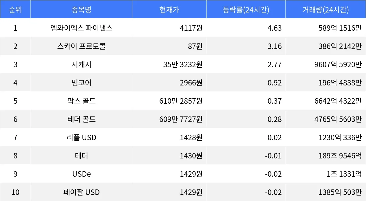 글로벌 가상자산 시황 중계 사이트 코인마켓캡(CoinMarketCap)에 따르면, 엠와이엑스 파이낸스가 암호화폐 시장에서 24시간 등락률 1위를 기록하며 주목받고 있다. 엠와이엑스 파이낸스는 24시간 동안 4.63% 상승하여 현재 4117원에 거래되고 있으며, 24시간 거래량은 589억 1516만 원에 이른다. 특히 1시간 동안 2.24%의 상승률을 보이며 단기적으로도 상승 추세를 유지하고 있다. 이로 인해 엠와이엑스 파이낸스는 시가총액 93위에 랭크됐다.스카이 프로토콜이 24시간 동안 3.16% 상승하여 87원에 거래되고 있으며, 1시간 동안 0.30%의 상승세를 기록했다. 스카이 프로토콜의 24시간 거래량은 386억 2142만 원으로 확인되며, 시가총액 순위는 55위로 올라섰다. 이러한 상승세는 스카이 프로토콜의 단기적 강세를 보여주는 지표라 할 수 있다.