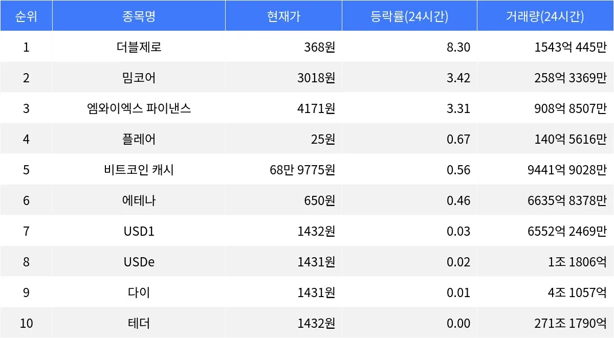 글로벌 가상자산 시황 중계 사이트 코인마켓캡(CoinMarketCap)에 따르면, 최근 암호화폐 시장에서 더블제로가 주목받고 있다. 더블제로는 24시간 동안 8.30% 상승하며 현재 368원에 거래되고 있으며, 24시간 거래량은 1543억 445만 원으로 나타났다. 이는 시장 내 주요 상승률을 기록한 수치로, 시가총액은 1조 2798억 원으로 75위를 차지하고 있다. 그러나 1시간 동안은 2.09% 하락하며 단기적으로 조정받고 있는 모습이다.두 번째로 주목할 종목은 밈코어이다. 밈코어는 24시간 동안 3.42% 상승하며 현재 3018원에 거래되고 있다. 시가총액은 3조 1372억 원으로 43위에 랭크되어 있으며, 24시간 거래량은 258억 3369만 원을 기록했다. 1시간 동안은 0.11% 하락하며, 역시 단기적으로는 약간의 조정세를 보이고 있다.