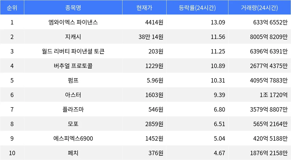 한편, 아스터는 24시간 동안 9.39% 상승하며 현재 1603원에 거래되고 있으며, 1시간 동안 0.31% 상승했다. 플라즈마는 24시간 동안 6.80% 상승하며 현재 546원에 거래되고 있으며, 1시간 동안 2.20% 상승했다. 모포는 24시간 동안 6.51% 상승하며 현재 2859원에 거래되고 있으며, 1시간 동안 0.59% 상승했다. 에스피엑스6900은 24시간 동안 5.04% 상승하며 현재 1452원에 거래되고 있으며, 1시간 동안 -0.61% 하락했다. 페치는 24시간 동안 4.67% 상승하며 현재 376원에 거래되고 있으며, 1시간 동안 -2.28% 하락했다.