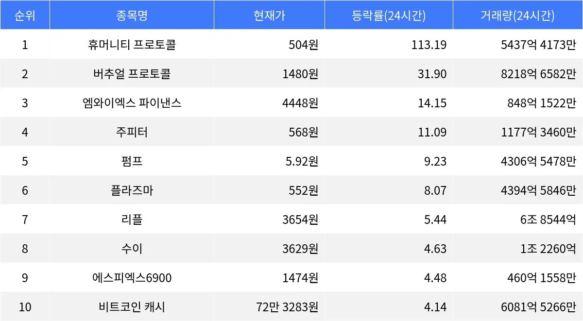 글로벌 가상자산 시황 중계 사이트 코인마켓캡(CoinMarketCap)에 따르면, 최근 암호화폐 시장에서 가장 큰 상승세를 보인 종목은 휴머니티 프로토콜이다. 휴머니티 프로토콜은 24시간 동안 113.19% 상승하며 현재 504원에 거래되고 있으며, 시가총액은 1조 992억 원으로 시가총액 순위 82위를 기록했다. 24시간 동안 5437억 4173만 원의 거래량을 기록하며, 1시간 등락률은 0.51% 상승했다. 이는 상승세가 지속되고 있음을 나타낸다.버추얼 프로토콜도 주목할 만하다. 24시간 동안 31.90% 상승하며 현재 1480원에 거래되고 있다. 시가총액은 9710억 664만 원으로 시가총액 순위 90위에 올라있다. 하지만 1시간 등락률은 -6.21%로 단기적으로 하락세로 전환된 모습이다. 거래량은 8218억 6582만 원을 기록했다.