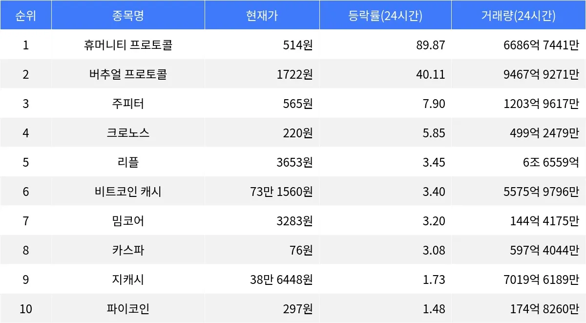 글로벌 가상자산 시황 중계 사이트 코인마켓캡(CoinMarketCap)에 따르면, 암호화폐 시장에서 휴머니티 프로토콜이 24시간 등락률 1위를 기록하며 주목받고 있다. 휴머니티 프로토콜은 24시간 동안 89.87% 상승하여 현재 514원에 거래되고 있다. 이와 함께 24시간 거래량이 6686억 7441만 주에 이르며 시장의 관심을 받고 있다. 그러나 1시간 등락률은 -4.39%로 단기적으로는 조정 양상을 보이고 있다.