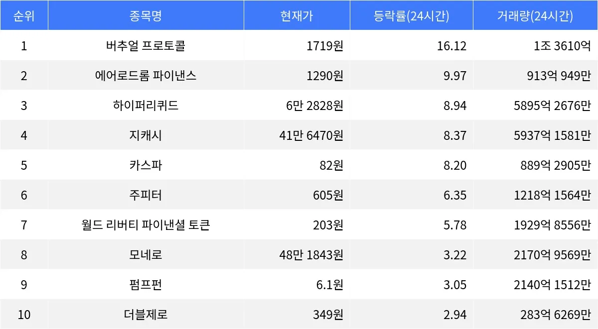 버추얼 프로토콜은 높은 거래량과 함께 단기적인 조정세를 보이는 가운데, 에어로드롬 파이낸스는 안정된 시가총액 순위를 유지하고 있다. 하이퍼리퀴드는 기술적 플랫폼으로서의 강점을 지니며, 지캐시는 프라이버시를 중시하는 암호화폐로 주목받는다. 카스파는 비교적 낮은 가격대에서 안정적인 흐름을 보이고 있으며, 주피터는 금융 기술 플랫폼으로서의 역할을 강조한다.