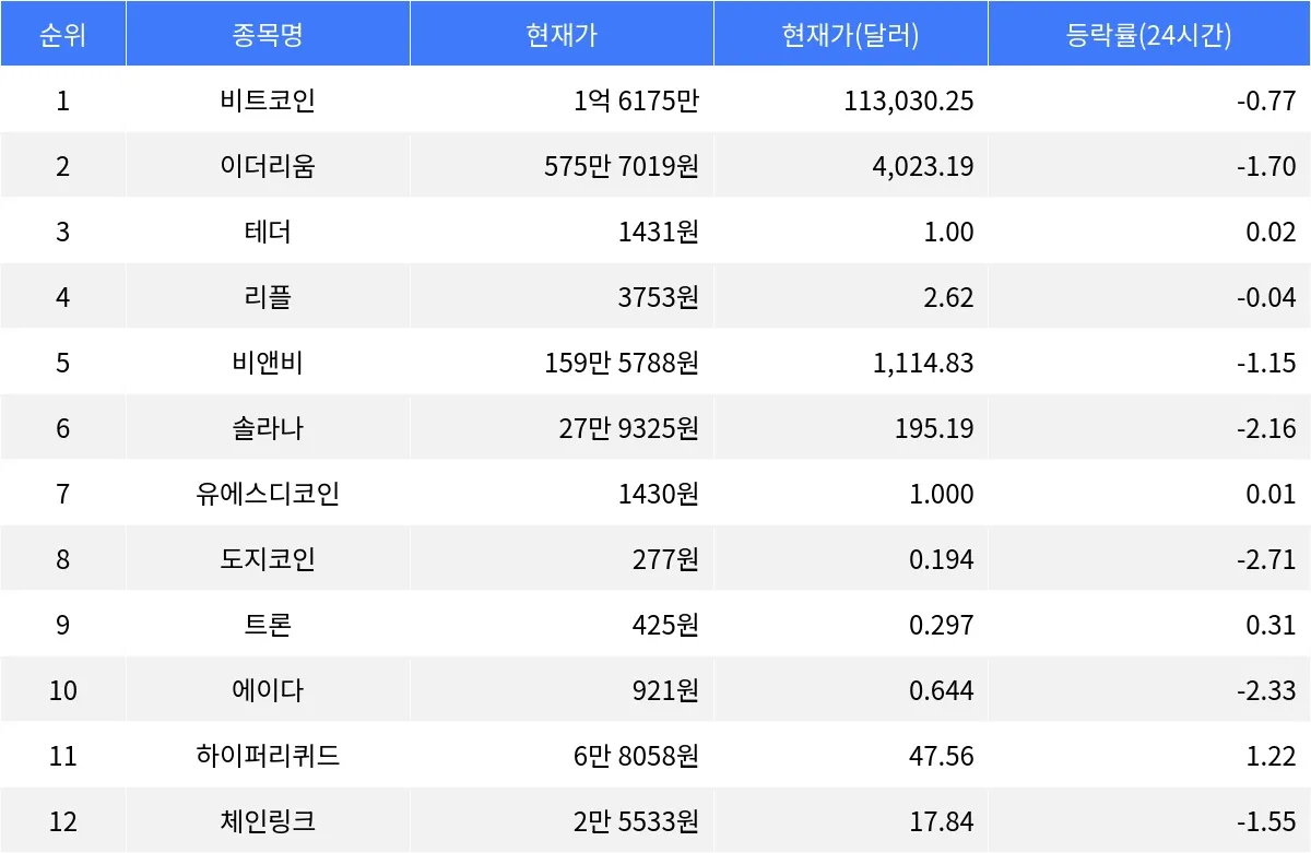 도지코인은 277원으로 2.71% 하락했으며, 거래량은 4조 178억원이다.