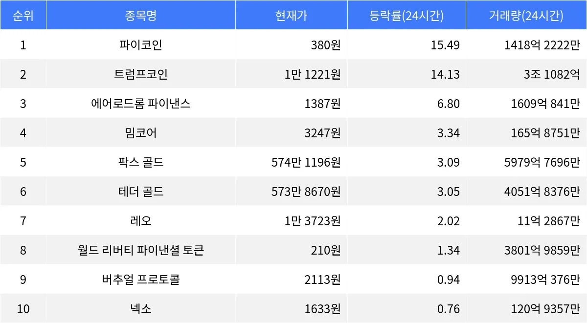 글로벌 가상자산 시황 중계 사이트 코인마켓캡(CoinMarketCap)에 따르면, 암호화폐 시장에서 파이코인은 24시간 동안 15.49% 상승하며 가장 높은 상승률을 기록했다. 현재 파이코인은 380원에 거래되고 있으며, 24시간 거래량은 1418억 2222만 원에 달한다. 1시간 등락률은 0.91%로 소폭 상승세를 유지하고 있으며, 시가총액은 3조 1533억 원으로 44위를 차지하고 있다.트럼프코인은 24시간 동안 14.13% 상승하여 현재 1만 1221원에 거래되고 있다. 1시간 등락률은 1.84%로 상승세를 보이고 있으며, 24시간 거래량은 3조 1082억 원이다. 시가총액은 2조 2442억 원으로 54위에 자리하고 있다.