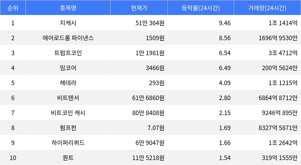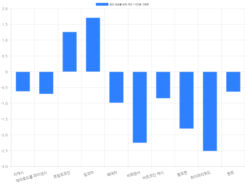 한편, 비트텐서는 24시간 동안 2.80% 상승하며 61만 6860원에 거래되고 있다. 1시간 등락률은 -2.25%로 단기적으로 하락세다. 비트코인 캐시는 24시간 동안 2.15% 상승하며 80만 8408원에 거래 중이며, 1시간 등락률은 -0.84%다. 펌프펀은 24시간 동안 1.69% 상승하며 7.07원에 거래되고 있고, 1시간 등락률은 -1.80%다. 하이퍼리퀴드는 24시간 동안 1.66% 상승하며 6만 9047원에 거래되고 있으며, 1시간 등락률은 -2.51%다. 마지막으로 퀀트는 24시간 동안 1.54% 상승하며 11만 5218원에 거래되고 있으며, 1시간 등락률은 -0.63%다.