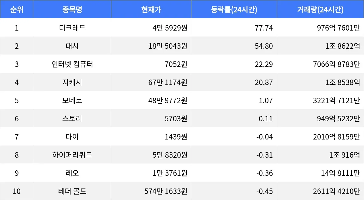 글로벌 가상자산 시황 중계 사이트 코인마켓캡(CoinMarketCap)에 따르면, 디크레드가 암호화폐 시장에서 가장 높은 24시간 등락률을 기록하며 주목받고 있다. 디크레드는 24시간 동안 77.74% 상승하며 현재 4만 5929원에 거래되고 있다. 1시간 등락률도 1.88% 상승하여 단기적으로도 강한 상승세를 보이고 있다. 24시간 거래량은 976억 7601만 원으로, 시가총액은 7855억 4534만 원으로 집계되며 시가총액 순위 94위를 차지하고 있다.