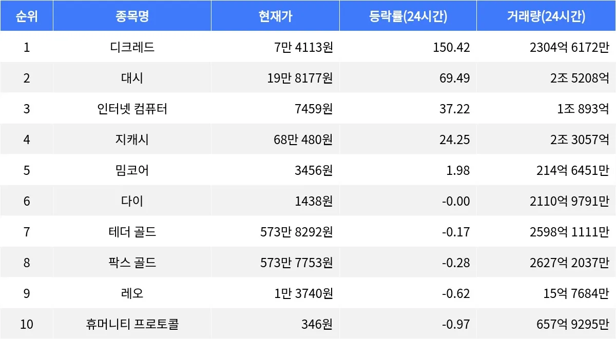 글로벌 가상자산 시황 중계 사이트 코인마켓캡(CoinMarketCap)에 따르면, 디크레드가 24시간 동안 150.42%의 폭발적인 상승률을 기록하며 주목받고 있다. 현재 디크레드는 7만 4113원에 거래되고 있으며, 24시간 거래량은 2304억 6172만 원에 달한다. 그러나 1시간 등락률은 -2.81%로 소폭 하락하여 단기적인 조정이 나타날 가능성도 있다. 시가총액은 1조 2676억 원으로, 시가총액 순위는 74위를 기록하고 있다.