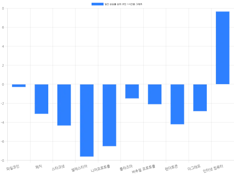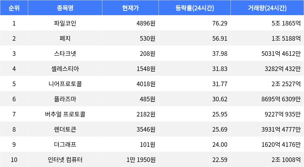 시가총액 89위의 스타크넷은 24시간 동안 37.98% 상승하며 현재 208원에 거래되고 있다. 1시간 동안에는 4.34% 하락하며 단기 조정이 나타났다. 시가총액 75위의 셀레스티아는 24시간 동안 31.83% 상승하며 1548원에 거래되고 있으며, 최근 1시간 동안 7.60% 하락했다. 니어프로토콜은 31.77% 상승하며 4018원에 거래 중이다. 시가총액은 5조 1410억 원으로 32위에 위치하며, 최근 1시간 동안 6.51% 하락하였다.
