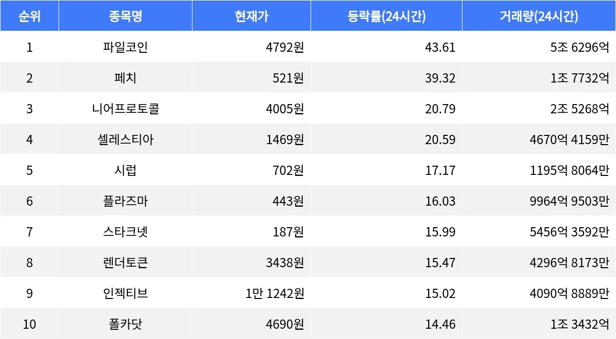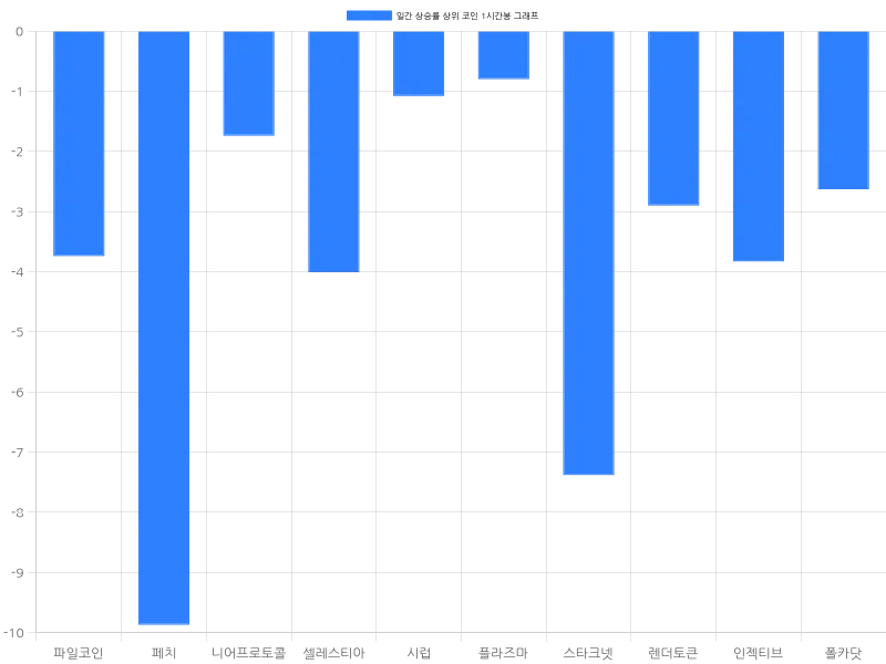 같은 시각, 플라즈마는 24시간 동안 16.03% 상승하며 443원에 거래되고 있으며, 1시간 동안 -0.80%의 하락세를 보이고 있다. 스타크넷은 15.99% 상승해 187원에 거래되고 있으나 1시간 동안 -7.38% 하락했다. 렌더토큰은 15.47% 상승하며 3438원에 거래 중이고, 인젝티브는 15.02% 상승해 1만 1242원에 거래되고 있다. 마지막으로, 폴카닷은 24시간 동안 14.46% 상승하며 4690원에 거래되고 있으며, 1시간 동안 -2.63%의 하락세를 보이고 있다.
