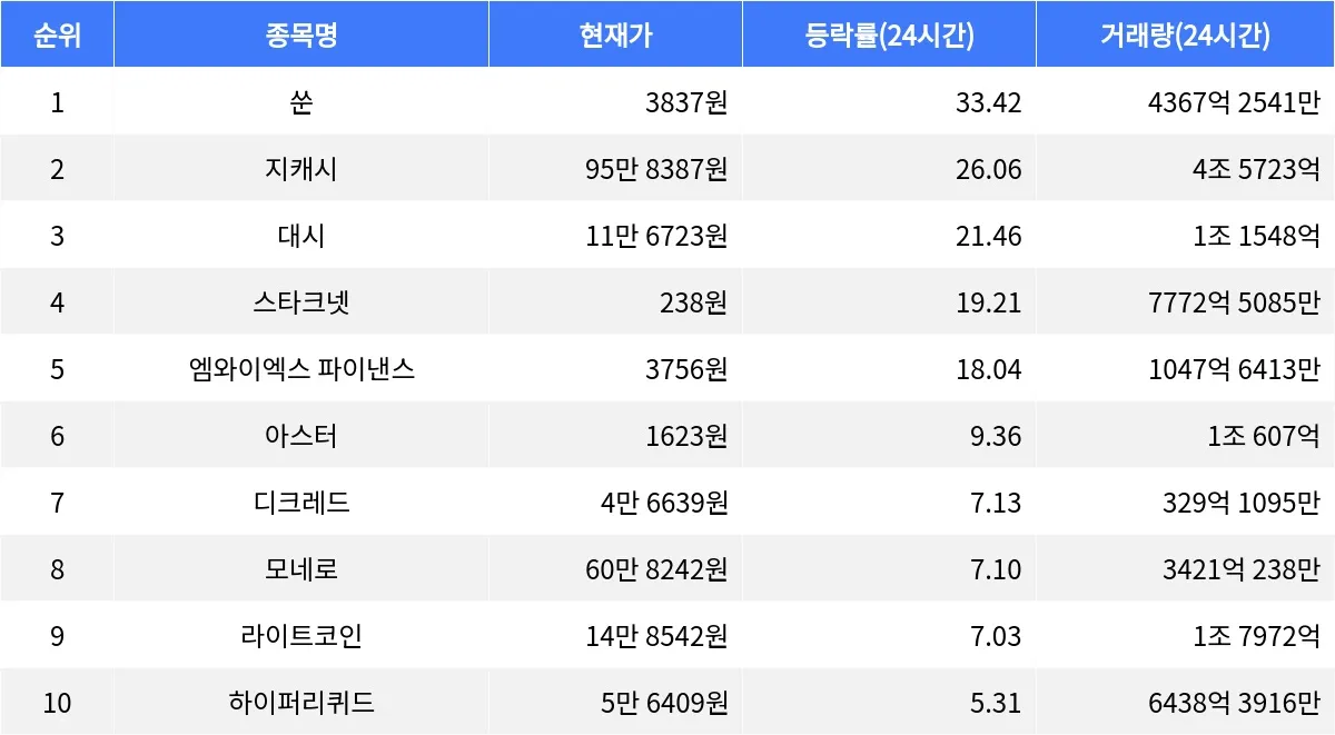 글로벌 가상자산 시황 중계 사이트 코인마켓캡(CoinMarketCap)에 따르면, 최근 암호화폐 시장에서 쑨이 24시간 동안 가장 높은 상승률을 기록하며 주목받고 있다. 쑨은 33.42% 상승하며 현재 가격은 3837원에 거래되고 있고, 24시간 거래량은 4367억 2541만 원에 달한다. 다만, 1시간 등락률이 -2.41%로 나타나며 단기적으로는 약간의 조정이 있는 모습이다.
