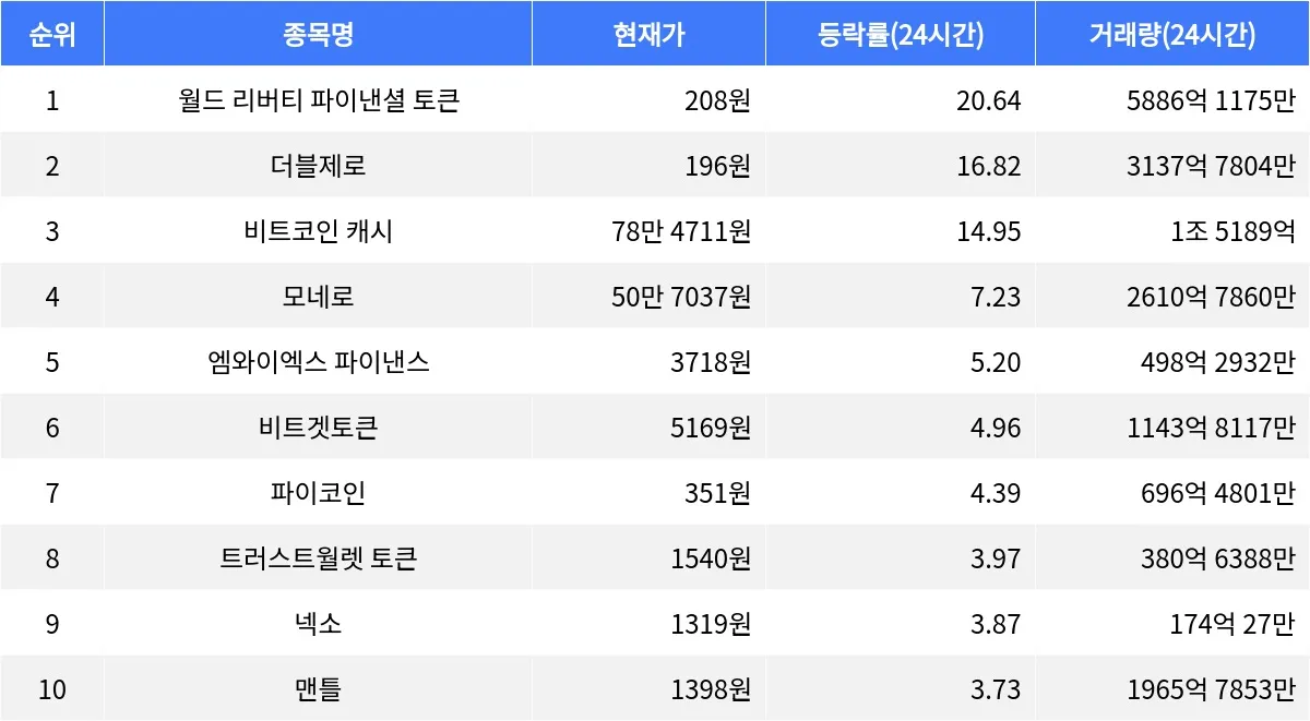 글로벌 가상자산 시황 중계 사이트 코인마켓캡(CoinMarketCap)에 따르면, 월드 리버티 파이낸셜 토큰이 24시간 동안 20.64% 상승하며 암호화폐 시장에서 가장 높은 상승률을 보이고 있다. 현재 208원에 거래 중인 이 토큰은 24시간 동안 5886억 1175만 원의 거래량을 기록했으며, 시가총액은 5조 1348억 원으로 30위에 올라 있다. 1시간 등락률은 0.04%로 소폭 상승세를 유지하고 있다.
