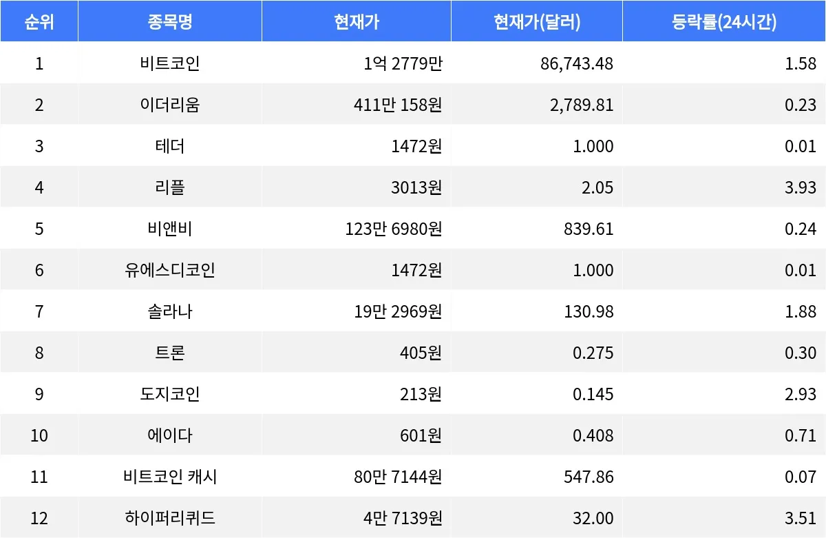 24일 10시 30분 글로벌 가상자산 시황 중계 사이트 코인마켓캡(CoinMarketCap)에 따르면, 비트코인은 현재 1억 2779만원으로 거래되고 있으며, 24시간 동안 1.58% 상승했다. 비트코인은 전 세계에서 가장 널리 사용되는 암호화폐로, 탈중앙화된 디지털 통화 시스템을 지원한다. 최근 24시간 거래량은 88조 9670억원에 달한다.