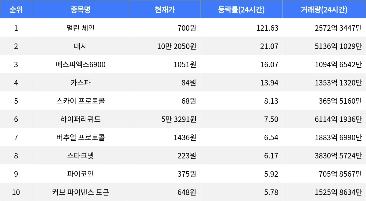 이어 대시는 24시간 동안 21.07% 상승하여 현재 10만 2050원에 거래 중이다. 시가총액 71위를 기록하고 있으며, 24시간 거래량은 5136억 1029만 원이다. 1시간 등락률은 2.07%로, 대시의 상승세 역시 안정적으로 지속되고 있다. 이 두 종목이 시장에서 가장 두드러진 상승세를 보이며 투자자들의 관심을 끌고 있다.