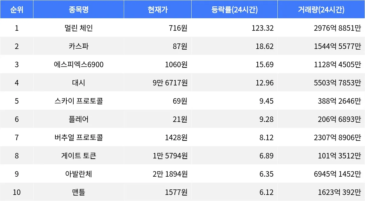 글로벌 가상자산 시황 중계 사이트 코인마켓캡(CoinMarketCap)에 따르면, 최근 암호화폐 시장에서 멀린 체인이 24시간 동안 가장 높은 상승률을 기록했다. 멀린 체인은 123.32% 상승하며 현재 716원에 거래되고 있다. 거래량은 2976억 8851만 원으로, 시가총액은 7536억 3887만 원으로 집계되며 시가총액 순위는 95위를 기록하고 있다. 1시간 동안 3.94% 추가 상승하여 상승세를 이어가고 있다.