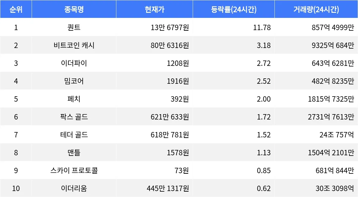 글로벌 가상자산 시황 중계 사이트 코인마켓캡(CoinMarketCap)에 따르면, 암호화폐 시장에서 퀀트는 24시간 동안 11.78% 상승하며 가장 높은 상승률을 기록했다. 현재 퀀트는 13만 6797원에 거래되고 있으며, 시가총액은 1조 6515억 원으로 63위에 위치해 있다. 24시간 거래량은 857억 4999만 원에 달하며, 1시간 등락률은 -0.84%로 소폭 하락세를 보였다.